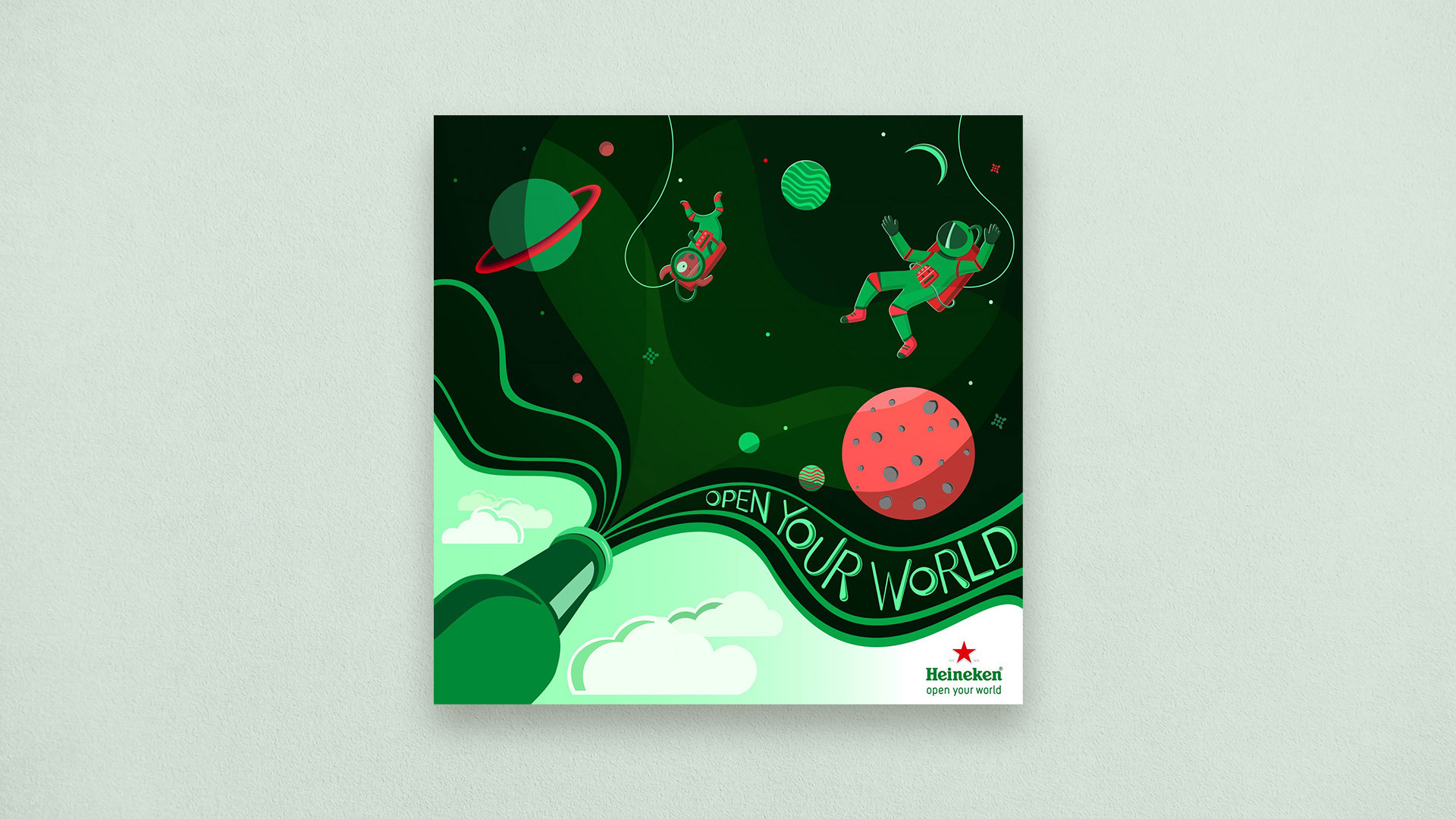 Illustration for Heineken's "Open Your World" creative brief on Talenthouse. Character design, hand-sketched concepts, and a full vector illustration built around Heineken's colour palette.