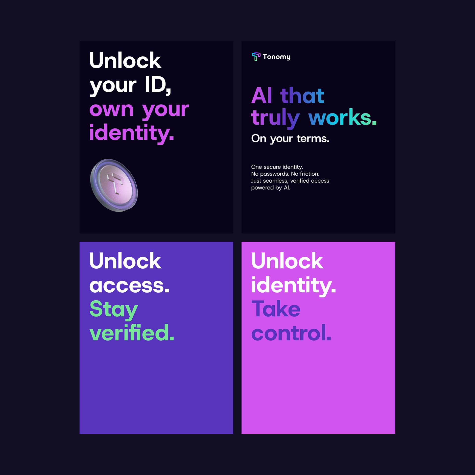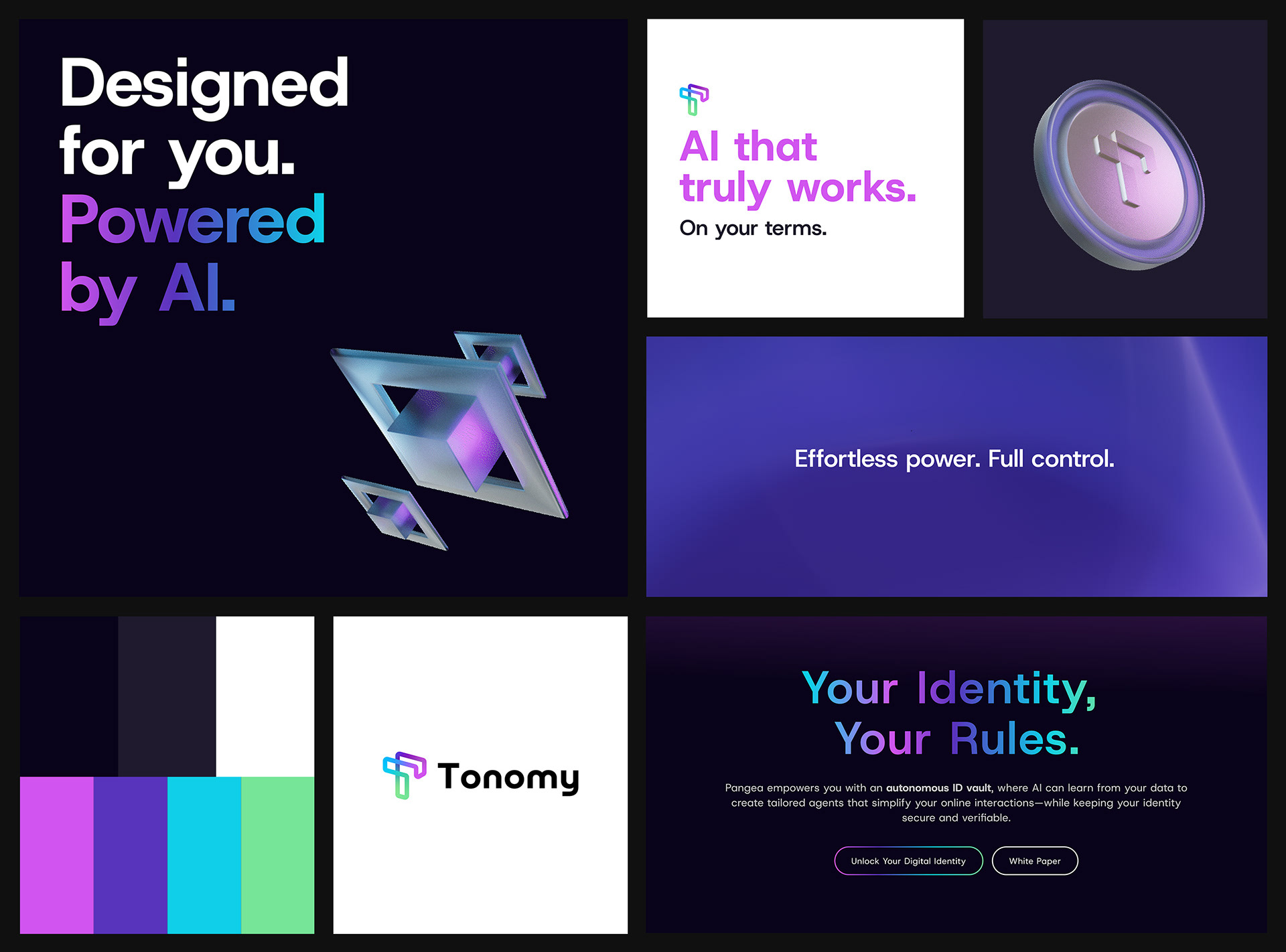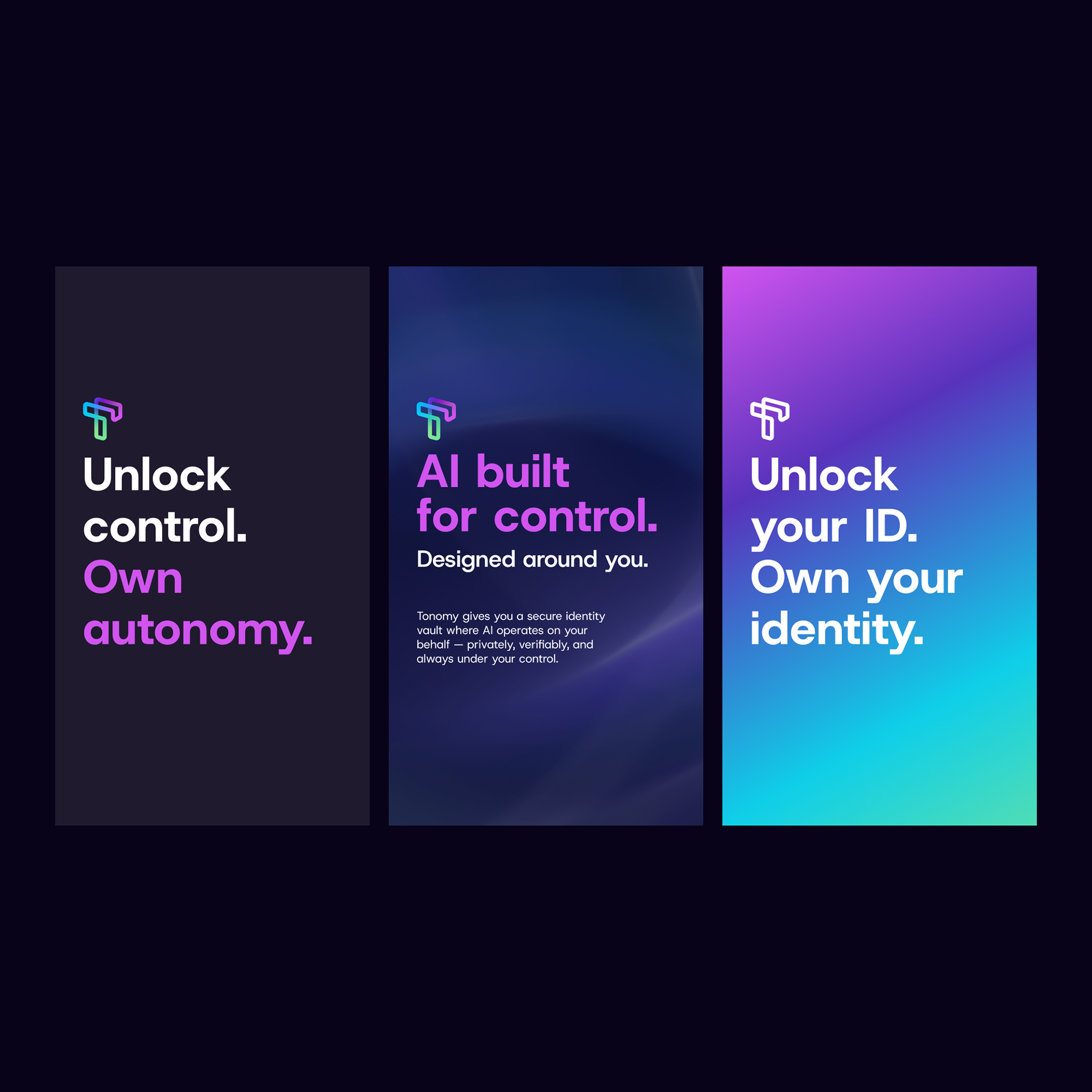 Tonomy is building a decentralised identity platform where users own their data. They needed a visual identity that could carry that message across web, social, presentations, and token ecosystems — and feel as seamless as the technology behind it.