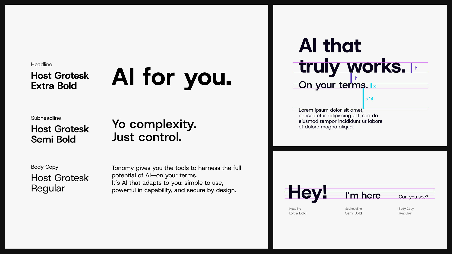 A platform like Tonomy needs to communicate across a lot of contexts: technical documentation, marketing, social, product UI. One typeface had to work for all of it. Host Grotesk handles that range well, bold enough for headlines that need to punch through a dark background, and clean enough for longer body copy that people actually need to read.