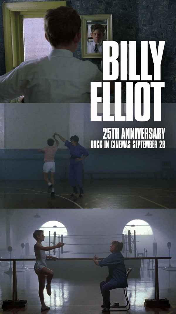 For Billy Elliot's 25th anniversary re-release, I created a series of social assets including cinemagraphs and a split-screen piece. The cinemagraph format works well here, isolating Billy mid-dance in a loop gives it a quiet, timeless quality that suits an anniversary. It doesn't feel like an ad, it feels like a memory. The split-screen pulls together scenes that trace Billy's journey, the mirror, the dance hall, the barre, capturing the emotional arc of the whole film in a few seconds. Each asset carries the same message: "This is worth seeing on the big screen again".