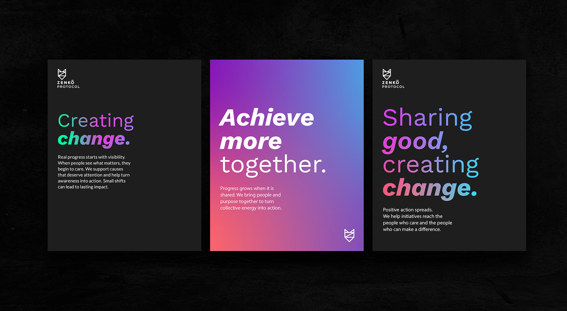 A logo and a colour palette don't mean much until they're out in the wild. This is the brand working across real touchpoints — from social media profiles to posters and promotional materials. Every piece follows the same angular, off-centre design language, so whether someone encounters Zenkō on X or on a printed poster, it feels like the same voice.