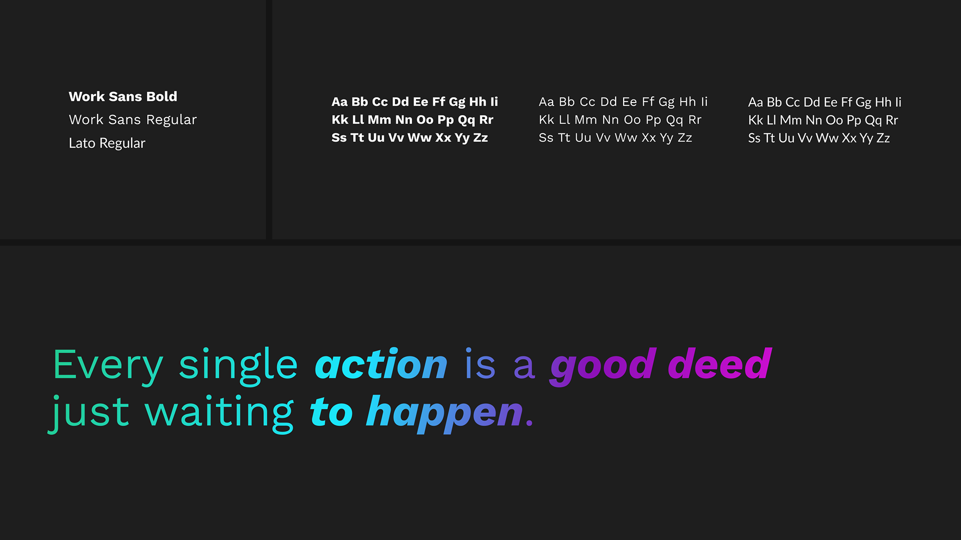 Work Sans hits that middle ground. It's geometric enough to feel structured and modern, but has enough warmth to stay approachable. Using a mix of Regular, Bold, and Italics within a single headline gives each line a natural rhythm — you read it the way someone would say it. Lato picks up the body copy, keeping things clear and comfortable without competing for attention. Both are Google Fonts, which matters for a project that lives almost entirely on screen — fast loading, no licensing friction, and consistent rendering across devices.